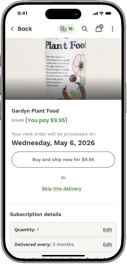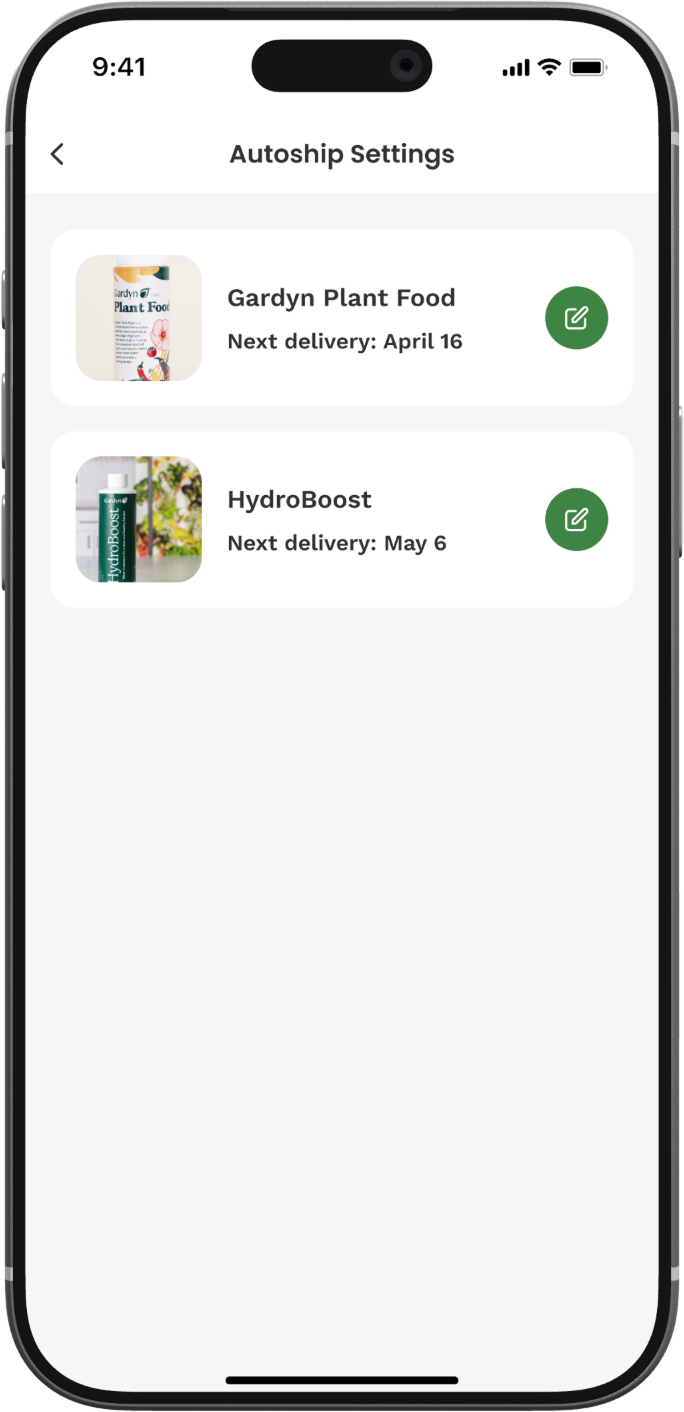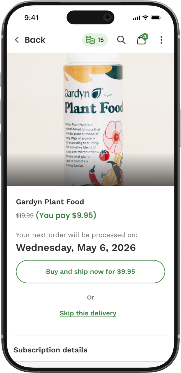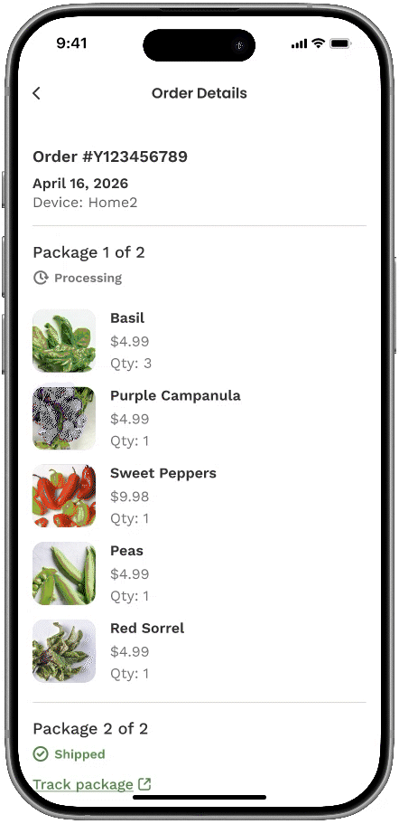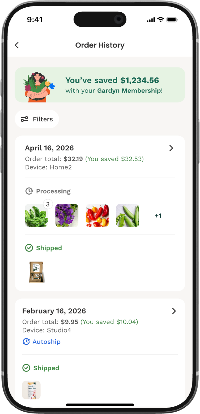 You can view your past orders, track shipments, and manage your subscriptions directly in the Gardyn app.