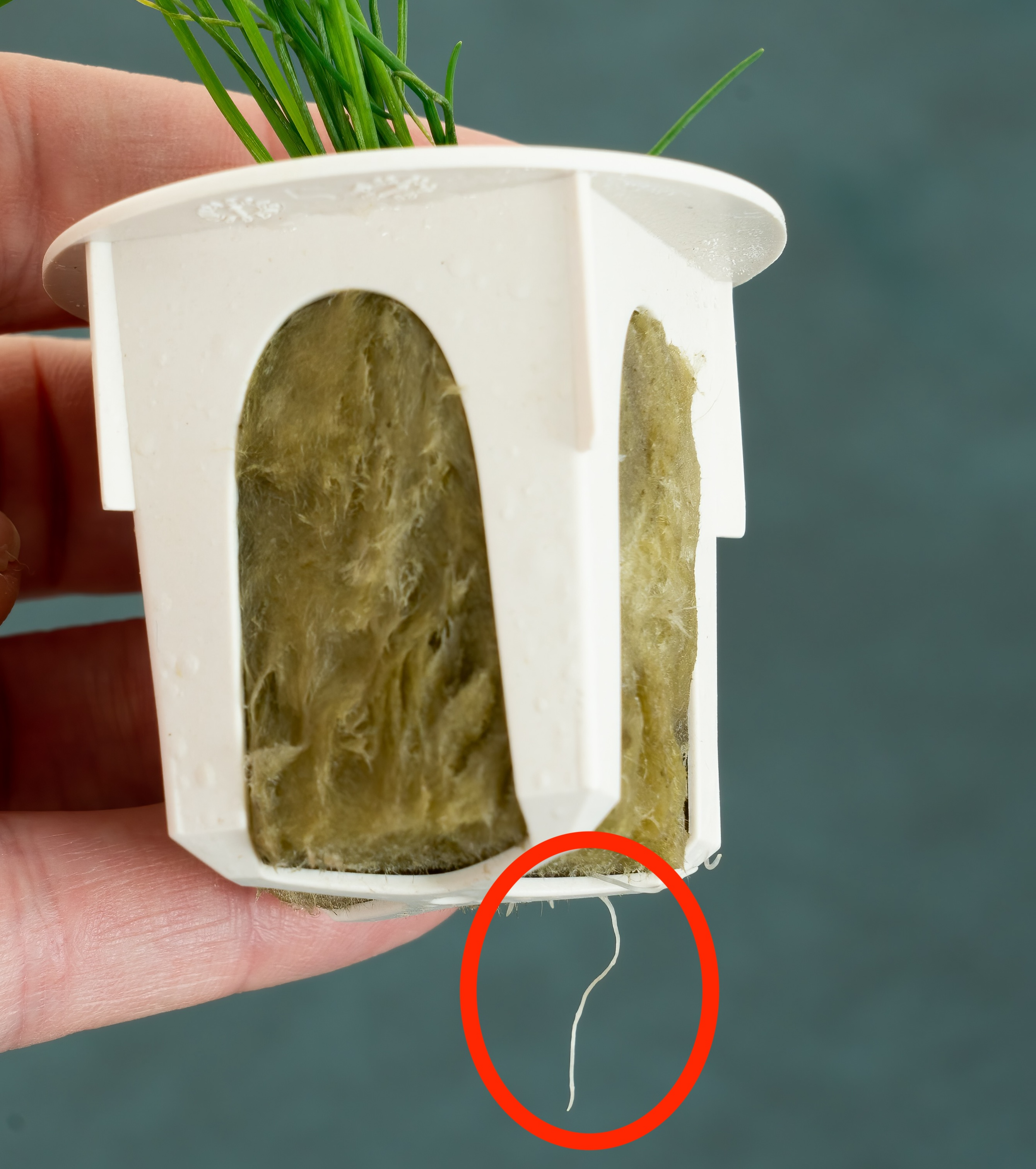 Half-inch roots growing out from the bottom of a Chives yCube.
